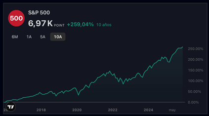 Es el referente mundial: engloba a las 500 empresas líderes de Estados Unidos.Representa una de las formas de inversión más accesibles y rentables que existen, ofreciendo un crecimiento sólido a largo plazo. $10,000 invertidos hace 10 años se han convertido hoy en $30,350.